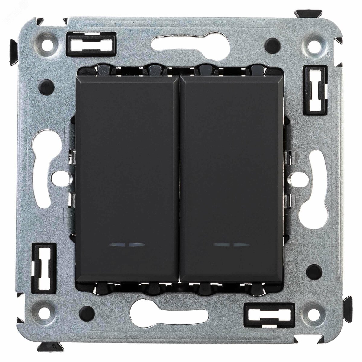 Переключатель двухклавишный в стену серии ‘Avanti’. Предназначен для монтажа в подрозеточные коробки (код 59301). Используется для включения/выключения освещения из двух мест. Диаметр отверстий для ввода кабелей – 3 мм (по 2 отверстия на одну клемму), винтовые зажимы, шаблон для зачистки кабеля – 11 мм. Номинальный ток – 16 A. Номинальное напряжение – 230 В. Для оснащения подсветкой необходимо заказать 2 лампы. Фиксация в подрозеточную коробку производится при помощи саморезов, 2 модуля. Цвет- ‘Черный матовый’.