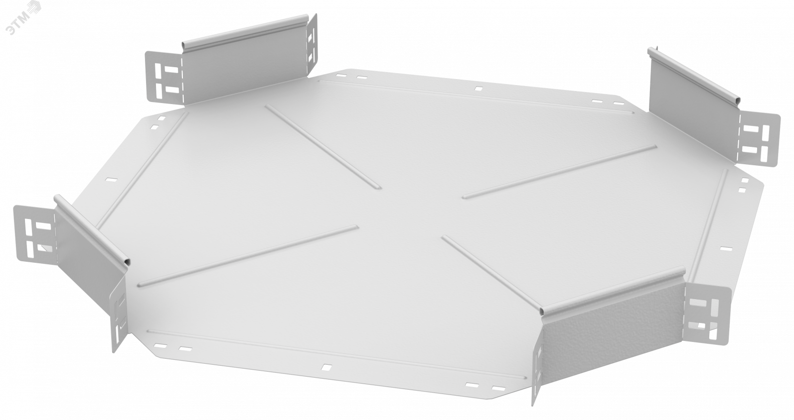 Крестовина предназначена для организации X-образного разветвления кабельной трассы в горизонтальной плоскости. Стыковка аксессуара с лотком осуществляется за счёт телескопического соединителя. Подходит для всех типов листовых лотков серии ESCA. Крышка на аксессуар заказывается отдельно. Аксессуар изготовлен из стали оцинкованной методом Сендзимира (защитный слой цинка не менее 5-10 мкм).