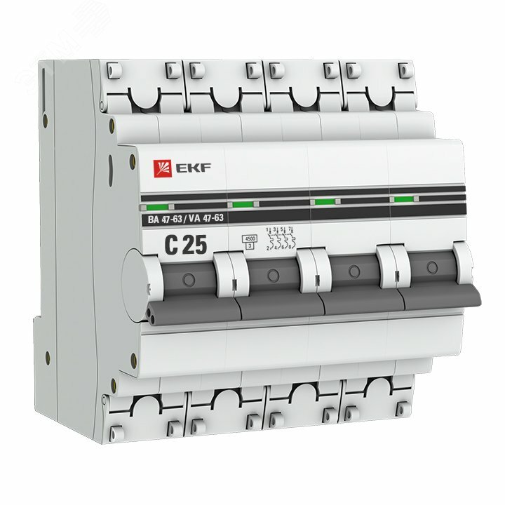 Выключатель автоматический четырехполюсный 25А С ВА47-63 4.5кА PROxima (mcb4763-4-25C-pro) от EKF — Номинальный ток, А: 25, Количество силовых полюсов: 4, Характеристика эл.магнитного расцепителя: C. Цена от 1 222.16i за шт.
