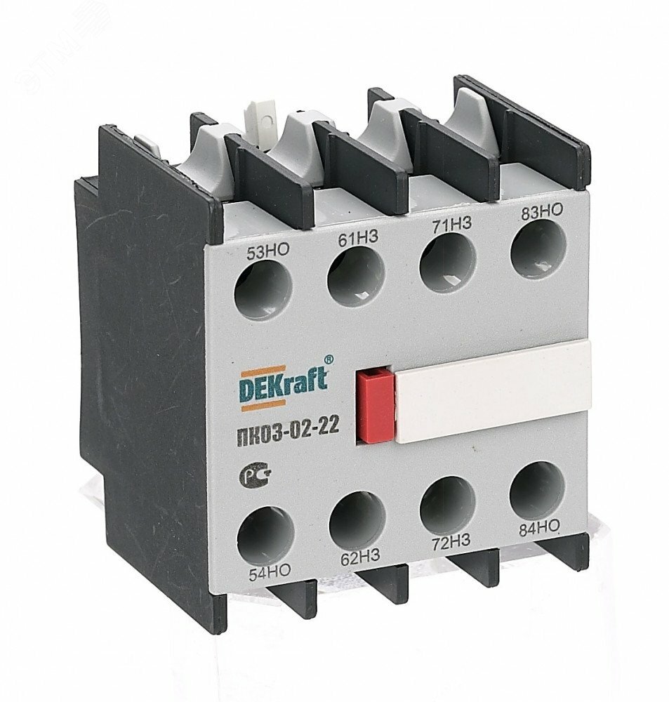 Приставка контактная серии ПК-03-02 для контакторов КМ-103 DEKraft, кол-во контактов — 2НО+2НЗ, ном.ток — 10 А, ном.напряжение — до 690 В, установка — с лицевой стороны, степень защиты — IP20. Приставки контактные предназначены для увеличения количества вспомогательных контактов контактора. Контактные приставки механически соединяются с контакторами и фиксируются при помощи защелки. Приставка подходит для использования с контакторами других производителей.