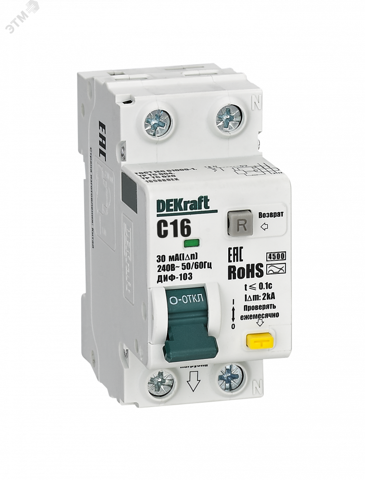 Автоматические выключатели дифференциального тока серии ДИФ-103 4,5кА NEW Dekraft, 1P+N, номинальный ток 16 А, ном. диф. ток 30 мА, тип диф. расцепителя — A, кривая отключения — С, Icn, Ics — 4,5 кА, тип устройства — электронный, монтаж – на DIN-рейку. АВДТ обеспечивают три вида защиты — от короткого замыкания, перегрузки и возникновения утечки тока (в частности, вследствие прикосновения человека к токоведущим частям). АВДТ с отключающей способностью 4,5кА применяются в распределительных, учётно-распределительных, телекоммуникационных щитах и др. в жилищном, гражданском строительстве, сельском хозяйстве, инфраструктуре объектов промышленности.
