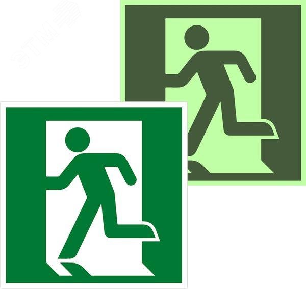 Знак эвакуационный E 01-01 »Выход здесь» (левосторонний) 200х200 мм, металл с покрытием фотолюминесцентным ГОСТ Р 12.4.026-2001 купить в Казани